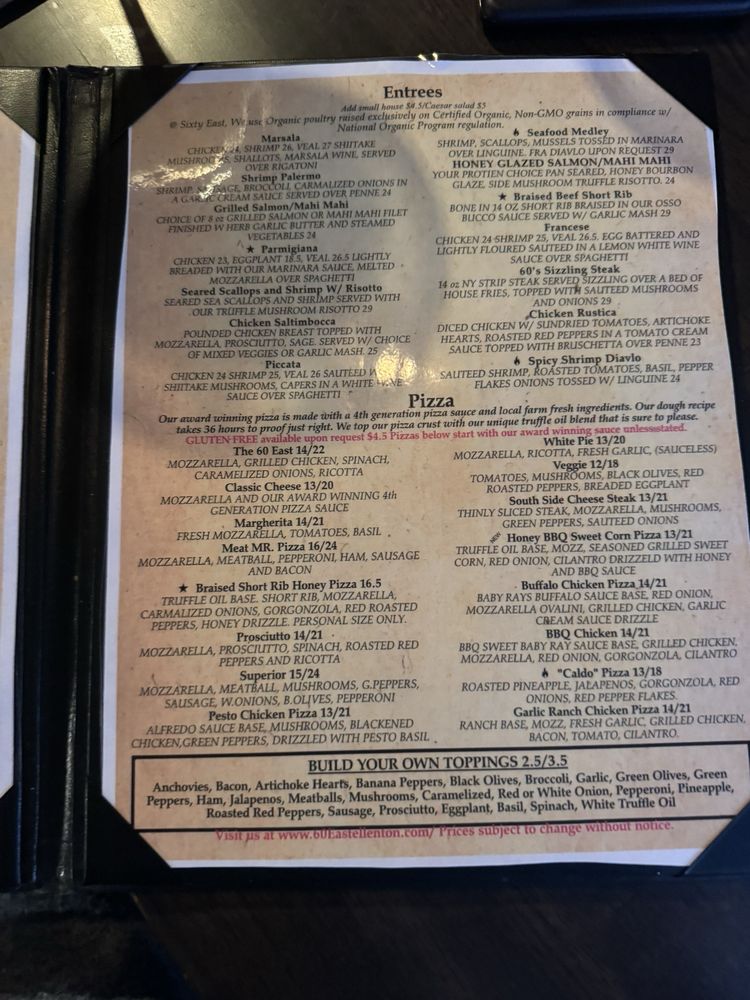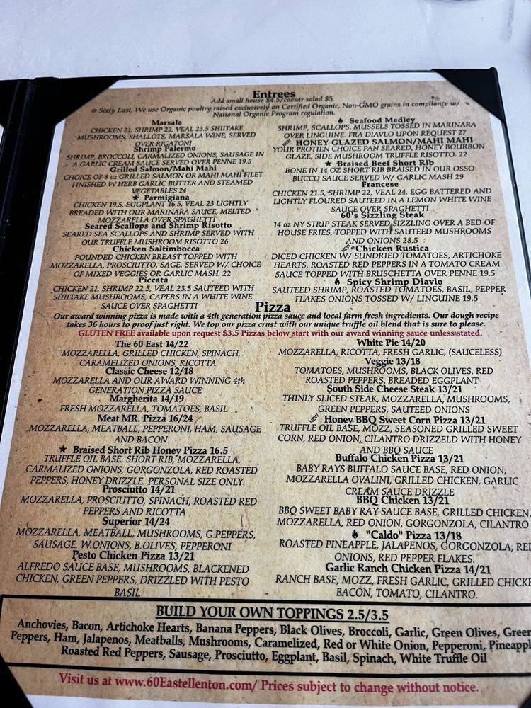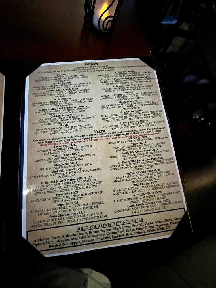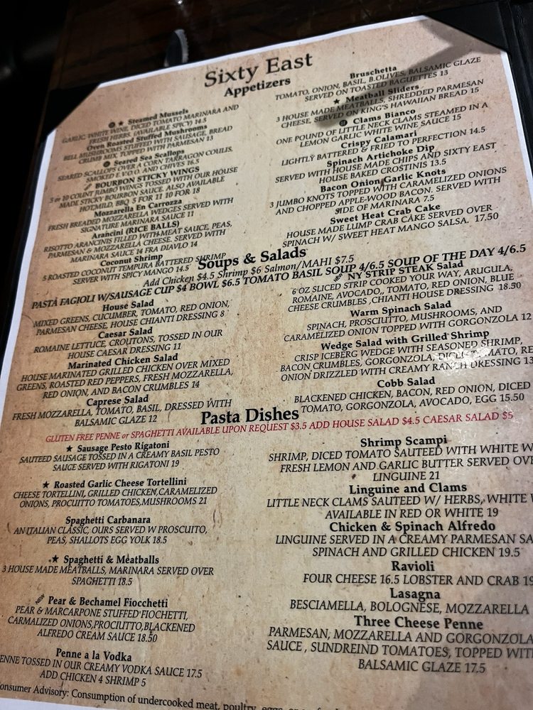 Located in Ellenton, FL, Sixty East Italian Cucina and Martini bar offers a range of delicious Italian dishes in a casual setting. With options for delivery, takeout, and catering, the restaurant caters to various dining needs. The menu includes appetizers like arancini rice balls and bacon onion garlic knots, as well as soups and salads such as Caesar salad, caprese salad, and cobb salad. Pasta dishes like chicken and spinach alfredo, lasagna, and linguine and clams showcase the authentic flavors of Italian cuisine. The restaurant also offers a full bar with happy hour specials, creating a lively atmosphere perfect for dining, dancing, and socializing. Overall, Sixty East Italian Cucina and Martini bar provides a memorable dining experience with a diverse menu and welcoming ambiance.